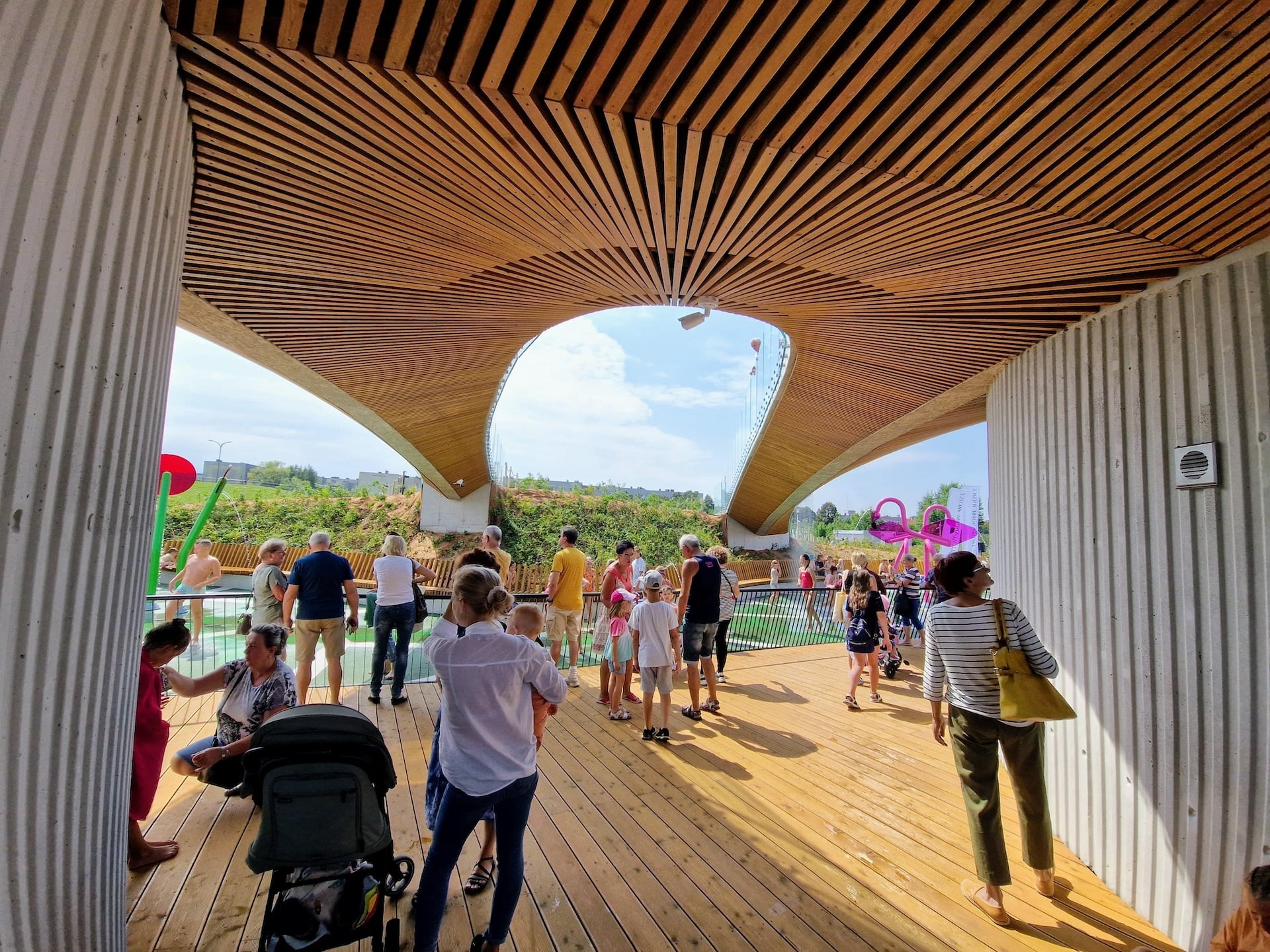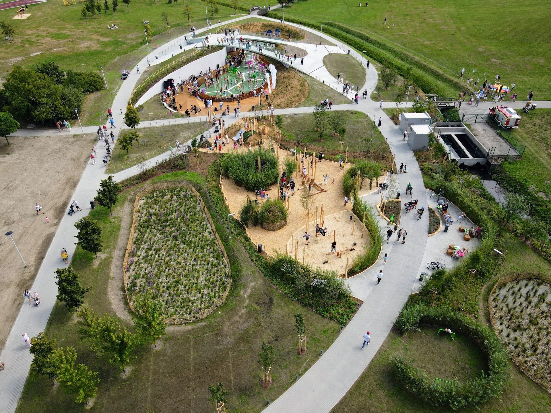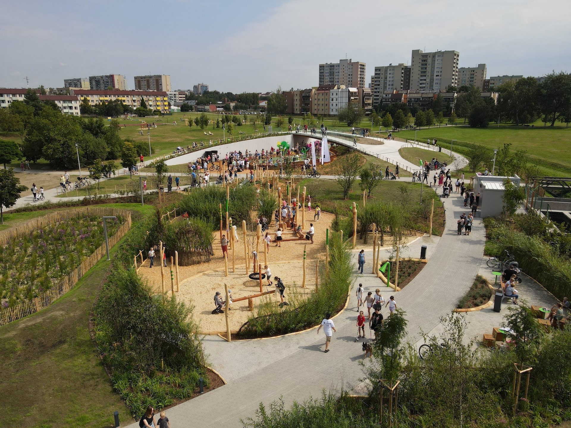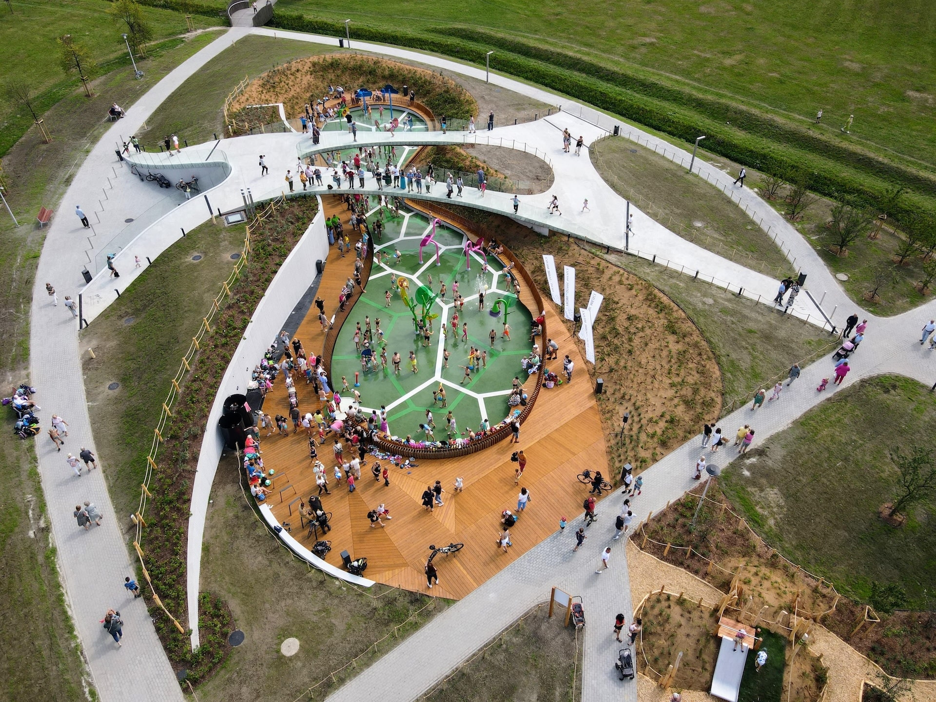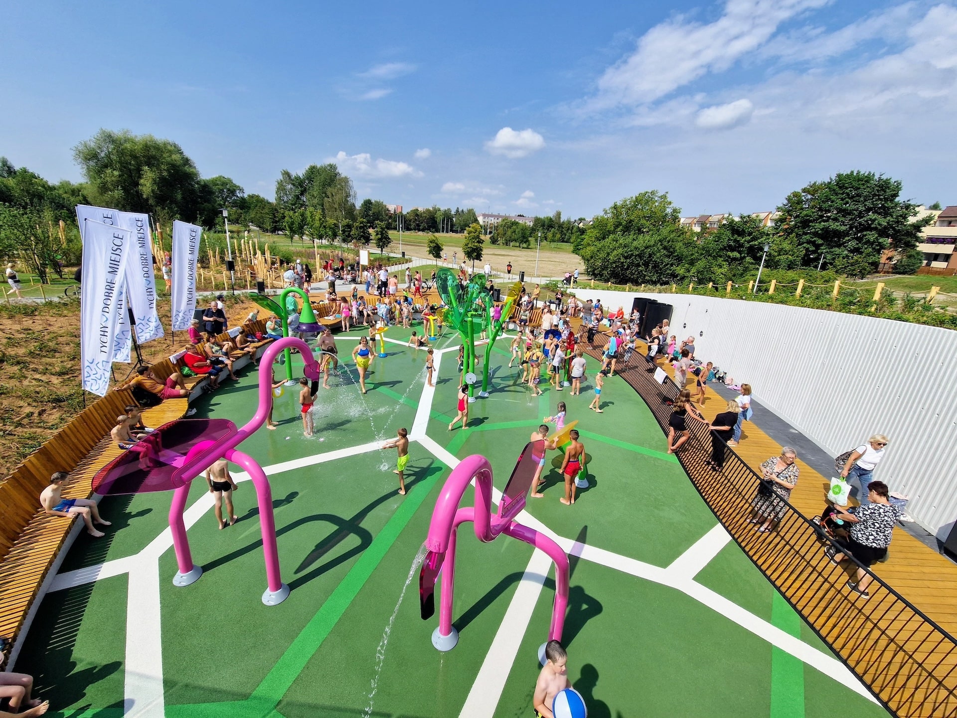 Wybudowaliśmy drugi wodny plac zabaw w mieście Tychy, mieszczący się w Parku Jaworek. Nowo otwarty obiekt nie tylko zapewnia atrakcje wodne, ale także wzbogaca przestrzeń rekreacyjną o elementy sensoryczne i naturalne, co czyni go wyjątkowym na tle innych tego typu miejsc. Niecka wodna placu zabaw, większa o 100 m² niż ta w Paprocanach, została starannie zaprojektowana, aby wkomponować się w istniejące ukształtowanie terenu i infrastrukturę podziemną. Otoczona drewnianym tarasem, stanowi idealne miejsce do zabawy, jednocześnie zapewniając komfort i bezpieczeństwo. Nad niecką umieszczono mostek wykonany w technologii żelbetonowej ze szklanymi balustradami, który nie tylko ułatwia przemieszczanie się między północną a południową częścią placu, ale także umożliwia rodzicom i opiekunom obserwację dzieci z perspektywy „z góry”. Rozbudowa strefy rekreacyjnej o naturalny plac zabaw w Parku Jaworek to doskonały przykład realizacji, która odpowiada na potrzeby zarówno dzieci, jak i ich opiekunów, tworząc przestrzeń idealną do aktywnego spędzania czasu na świeżym powietrzu.